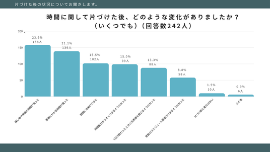 行動面でも、「探し物や準備にかかる時間が減った」(23.9%)、「家事の時間が短縮した」(21.1%)、「時間に余裕ができた」(15.5%)などの変化が見られました。
