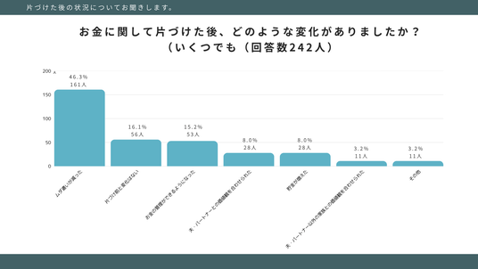 片づけを通じて「ムダ遣いが減った」(46.3%)、「お金の管理ができるようになった」(15.2%)といった回答が目立ち、家の整理整頓とともに、お金の「見える化」が進んだ結果、支出管理が促進されたと考えられます。