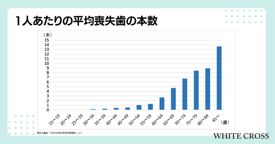 また、同調査の中では「何歳の時点でどれくらいの歯が抜けているか」の数字も明らかにされており、70歳の時点で6本以上、85歳では13.7本となっています。