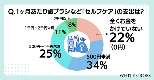 また、特に歯ブラシや歯磨き粉などセルフケア製品への支出では「0円」が22%、「500円未満」が34%と半数以上。「1000円未満」の合計では約80%に達しました。