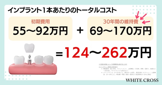 WHITE CROSSの試算では、1本欠損時におけるインプラント治療の30年間コストは以下の通り。