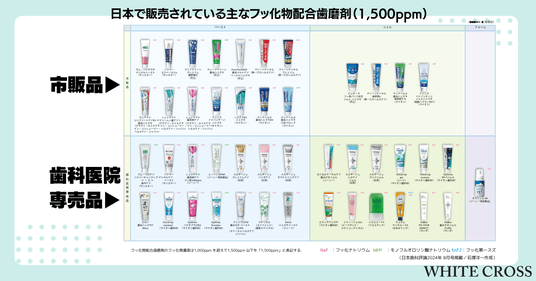 以下の図は、東京歯科大学衛生学講座 准教授/歯科医師の石塚洋一先生が作成された日本で販売されている主なフッ化物配合歯磨剤を市販品、歯科医院専売品に分けて一覧にしたものです。(日本歯科評論2024年8月号掲載)