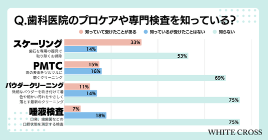 歯科専売品の認知が進んできている一方で、「歯科医院で受けることができる専門的な機材を使った歯のクリーニングや、最新技術を用いた検査があることを知っていますか?」という設問では、知らなかったと答えた人の割合が非常に多い結果に。