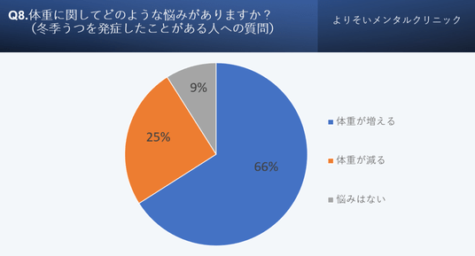 今回は、冬季うつに関して調査しました。冬季うつになると、食欲増加・睡眠過多・体重増加などが起こりやすく、一般的なうつとは症状が異なると分かりました。