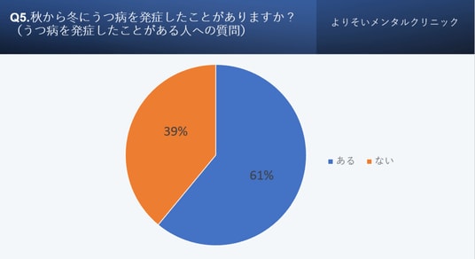 その結果、約61%の方が秋から冬に発症したと答えました。他の季節に比べてうつ病を発症しやすいと分かります。