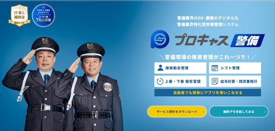 プロキャス警備は、ユーザー数を7万人突破し、年間継続率94.3%を誇る、労務管理システム「プロキャス」の警備業界特化型システムです。