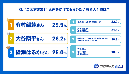 そこで、「“ご苦労さま!”と声をかけてもらいたい有名人」をたずねたところ、1位は有村架純さん(29.9%)、2位は大谷翔平さん(26.2%)、3位は綾瀬はるかさん(25.0%)という結果になりました。このように上位には、誠実で穏やか、かつ人を励ます存在として知られる有名人が並びました。