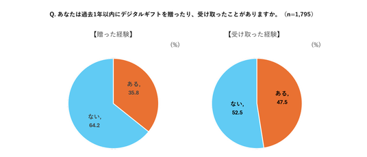 過去1年以内にデジタルギフトを「贈った経験がある」と回答した人は35.8%、「受け取った経験がある」と回答した人は47.5%となりました。自分で贈った経験よりも、受け取った経験がある人の割合が上回っており、約半数の方がデジタルギフトを受け取った経験をしていることが分かりました。