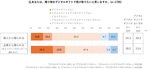また、個人から贈られる場合の「デジタルギフトがよい」「どちらかというとデジタルギフトがよい」の合計(24.3%)と比較しても上回っており、企業から贈られるデジタルギフトに抵抗を感じる方は少ないことが明らかになりました。