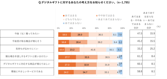 また、「デジタルギフトに対応する商品が増えてほしい」では「あてはまる」「ややあてはまる」の合計が60.1%となり、今後さらにサービスが充実することを望んでいる層も多いようです。前段の「贈り物をデジタルギフトで受け取りたくない理由」では、「利用店舗が限られる」では34.9%、「有効期限が短い」では20.4%の回答が見られました。対象商品の幅が広がることはもちろん、利用可能な店舗の拡大や有効期限の延長などによって、デジタルギフトは贈り物として、さらに広く浸透していく可能性が高いと考えられます。
