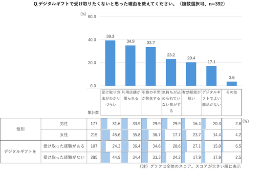 男女別で比較してみると、女性では「受け取り方法がわかりづらい」、男性では「気持ちが込められていない気がする」がそれぞれの性別と回答率の差が大きい結果となっています。