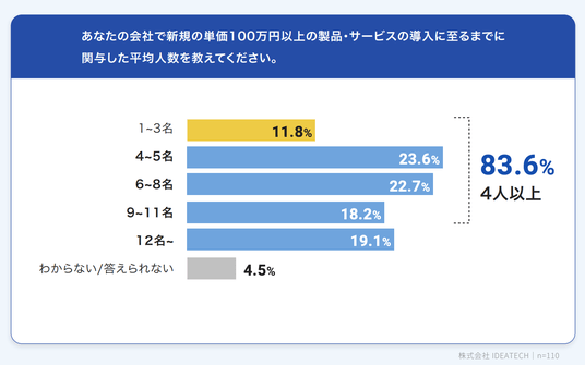 さらに、BtoB取引では関与する人数も多く、単価100万円以上の製品・サービスの導入において、83.6%の企業が「4人以上」が購入の意思決定に関与している実態が明らかになりました。