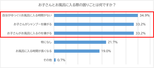 今回実施調査によると、お子さんとのお風呂に悩みを抱えている親が多い結果に。「ゆっくりお風呂に入る時間がない」「お子さんがお風呂やシャンプーを嫌がる」といった悩みが明らかになりました。