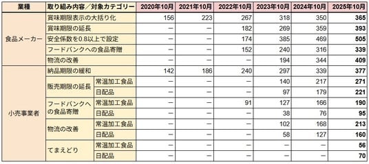 ※ 数値のない箇所は調査が行われていない。※フードバンクへの食品寄贈、販売期限の延長、及び物流改善については小売事業者は常温加工食品と日配品のそれぞれにおける取り組みの有無を尋ねており、ここではそれぞれの回答事業者数を単純合計した。そのため事業者の重複がある。