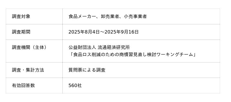 公益財団法人 流通経済研究所 (理事長:加藤 弘貴) は、2012年より設置している「食品ロス削減のための商慣習検討ワーキングチーム」の活動の一環として、食品メーカー、卸売業者、小売事業者を対象とし、2025年も「商習慣見直しの取り組み等」に関する調査を実施いたしました。消費者の皆様にも食品ロス削減に積極的に取り組む事業者の商品や店舗を応援していただけるよう、今回の調査結果を広く社会に発信します。また、事業者の皆様に取り組みを拡大するよう呼びかけ、食品ロスの削減に貢献してまいります。