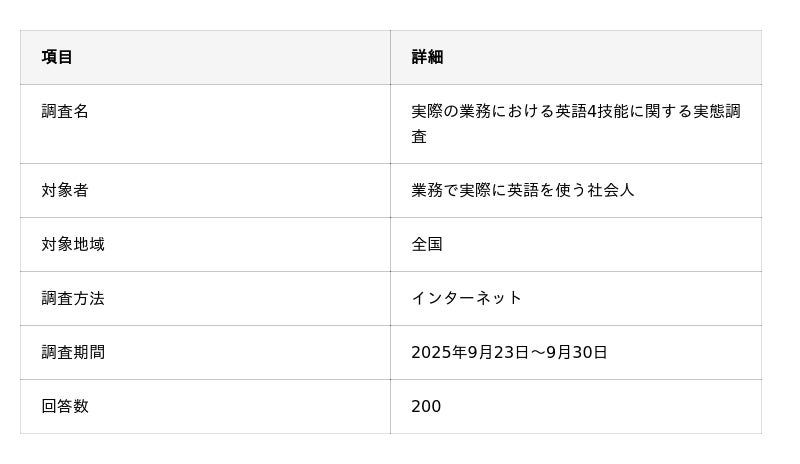 そこで本調査では、業務における英語4技能の活用実態と課題を明らかにすることを目的とした。