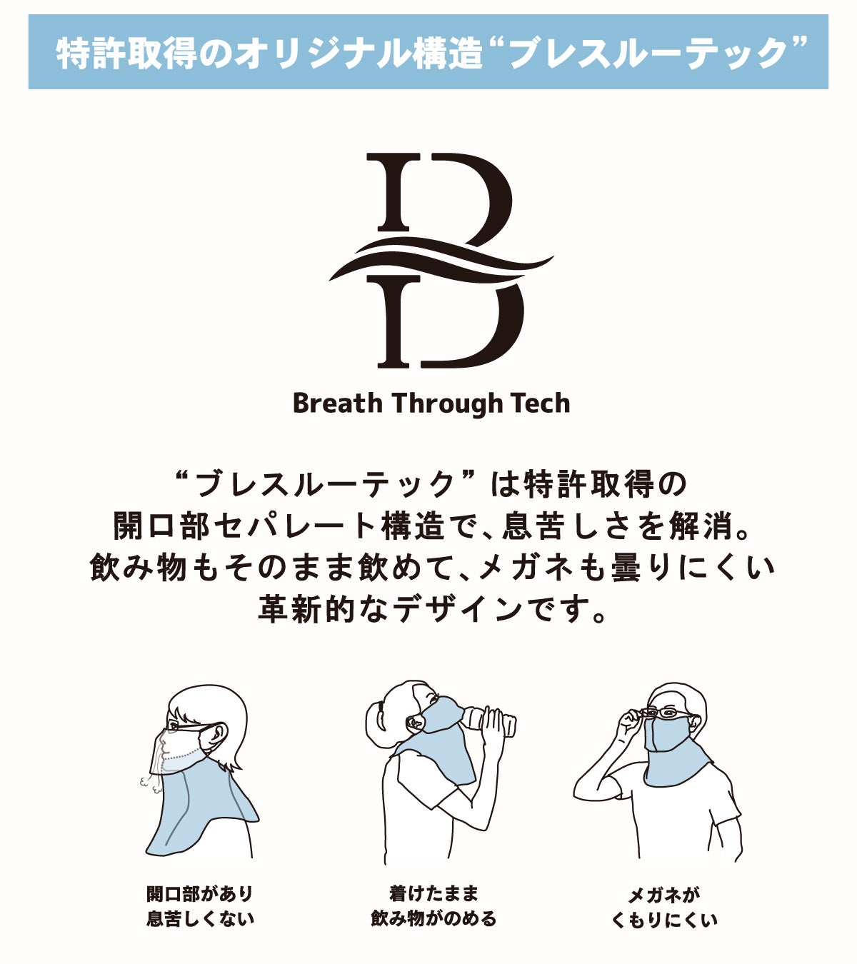 この快適さを実現したのが、私たちが特許を取得した独自技術「ブレスルーテック(Breathe Through Tech)」。開口部をセパレート構造にすることで、呼吸を妨げることなく、作業中の水分補給も簡単に行えます。さらに眼鏡もくもりにくいという革新的な設計です。 一般的なマスクと違って、ウイルス対策を考える必要がない紫外線対策専用だからこそ、このような快適性を追求した形状を実現することができました。![]()