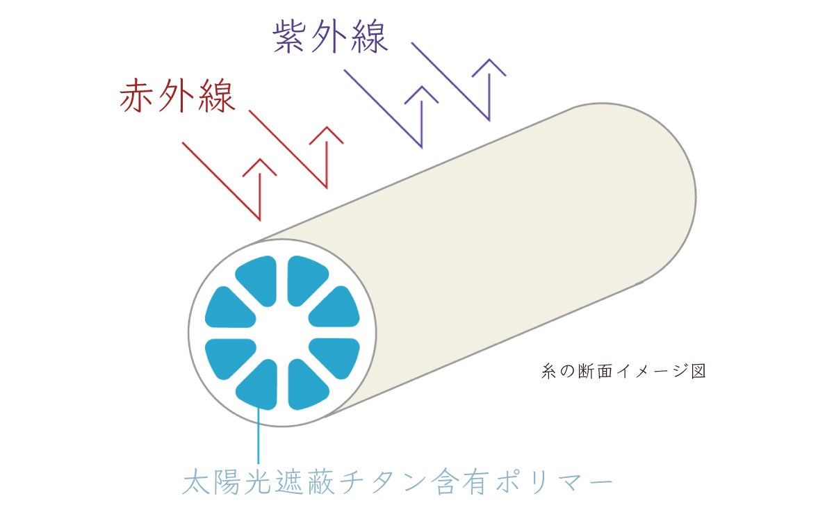 太陽光遮蔽チタンを練り込んだ特殊なポリマーを使用し、「糸」自体に紫外線カット効果があるので、洗濯をしてもUVカット率は変わらず、長く安心して使用していただける機能性を叶えることができました。