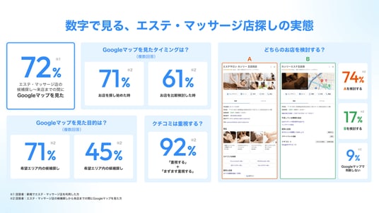 近年、エステ・マッサージ店探しにGoogle マップ(TM)︎を使用する人が増えており、いかにマップを整備するかが重要になっています。