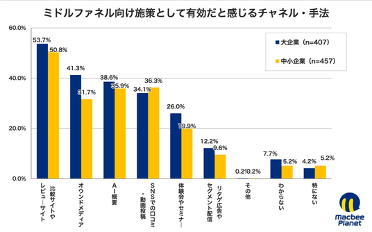 続いて、比較サイト、オウンドメディア、SNS口コミなど「ミドルファネル(※)施策」をどの程度重要視するか尋ねたところ、大企業81.0%、中小企業78.1%が「重要」(“非常に重要”、“ある程度重要”の合算)と回答しました。とりわけ「比較サイトやレビューサイト」(大企業53.7%/中小50.8%)が最も有効とされ、次いで「オウンドメディア」「SNSでの口コミ・動画投稿」「AI概要(検索結果上部のAI要約)」など、ユーザーの“検討行動”を支援する手法が上位に挙がりました。