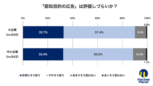 さらに「認知目的の広告は成果につながるか」という問いに対しては、大企業で85.6%、中小企業で88.2%が「そう思う」(“非常にそう思う”、“ややそう思う”の合算)と肯定的でしたが、同時に「認知広告は評価が難しい」と回答した割合はどちらも約9割に達し、成果を感じつつも“測れない”という矛盾を抱えていることが浮き彫りとなりました。