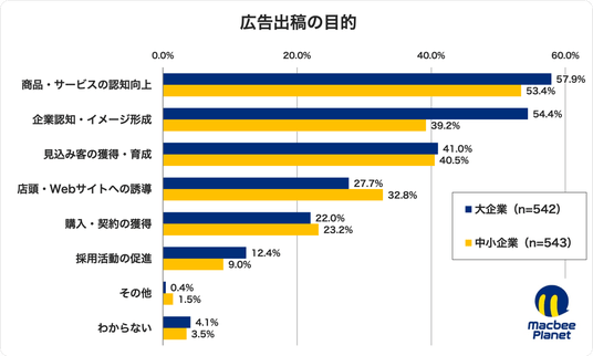 企業のマーケティング担当者1,085名に対して、広告出稿の主目的を尋ねたところ、大企業では「商品・サービスの認知向上」(57.9%)と「企業認知・イメージ形成」(54.4%)が上位に挙がり、依然として“認知重視”の傾向が明確でした。