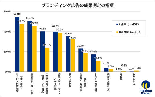 ブランディング広告の成果を測定する上での指標について尋ねたところ、大企業では「(企業・商品・サービスの)認知度」(54.8%)や「広告認知率・想起率」(40.3%)など調査ベースの指標が上位に並びました。対して中小企業では、同様に「認知度」(47.5%)が最も多いものの、「店頭・Webサイトへの来訪数」(39.2%)や「購入・契約数」(32.6%)といった行動データ中心の評価が相対的に多く見られ、規模に応じた“見える成果”への志向が確認されました。