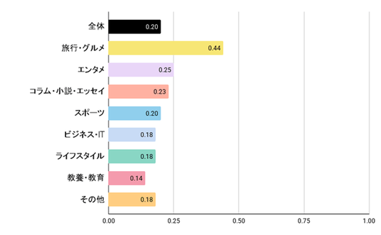 一方、旅行・グルメのカテゴリーでは、検索流入とAI流入の相関係数が0.44と、他のカテゴリーに比べてやや高い値を示しました。検索とAIの双方で流入しているジャンルと言えます。