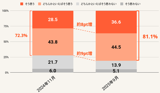 また「1年前(2024年)と比較したとき、生成AIはマーケティング業務の役に立つようになってきた」という主張に対しては、「そう思う」「どちらかといえばそう思う」と肯定した人の合計が81.1%となり、前回調査(72.3%)から約9ポイント増加しました 。“生成AIの実用性への手応え”が、マーケティングの現場で確立されてきていることが分かります。