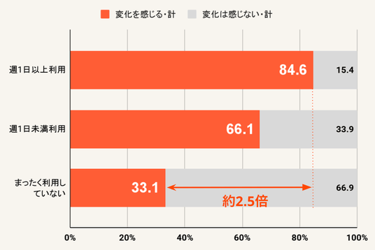 AIの利用頻度別に顧客行動の変化への認識を見たところ、AIの利用頻度が高い人ほど、顧客行動の変化を感じる傾向が強いことが分かりました 。具体的には、生成AIを週1日以上利用する人のうち84.6%が「変化を感じる」と回答した一方、非利用者で同様に回答した人は33.1%にとどまり、約2.5倍の差が見られました 。