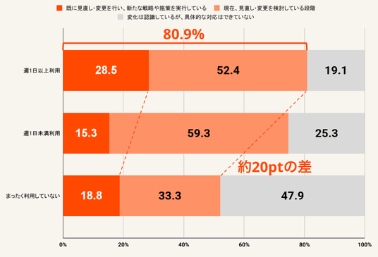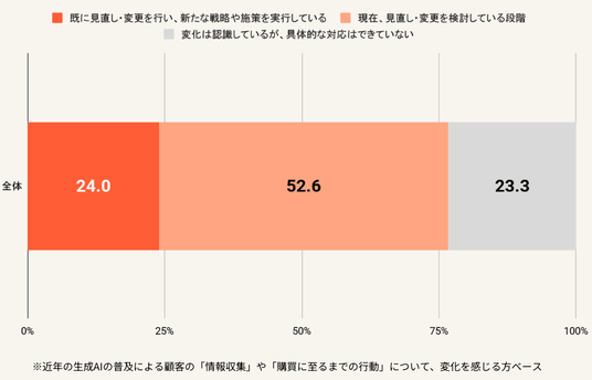 一方で、変化を感じている人に「顧客の変化に対応するため、戦略や施策の見直し・変更を行っていますか」と聞いたところ、「既に見直し、実行している」と回答した人は24%にとどまりました 。最も多い回答は「見直しや変更を検討している」(52.6%)で、「変化の認識」と「実際の行動」との間に明確なギャップが存在することが明らかになりました 。