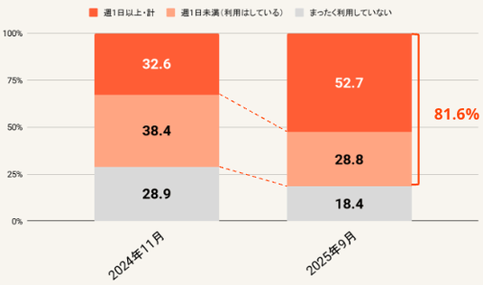 生成AIを業務に利用している人は、回答者全体の81.6%に達しました 。特に「週1日以上利用している」層は52.7%となり、前回調査の32.6%から大きく増加しました 。一方で「まったく利用していない」層は18.4%に減少(前回調査では28.9%)し、生成AIの業務活用が本格化している様子がうかがえます 。