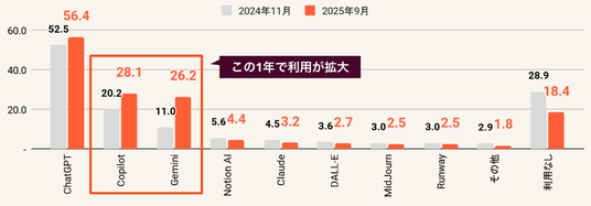 利用者が最も多かったツールは「ChatGPT」(56.4%)でしたが、「Copilot」(28.1%)と「Gemini」(26.2%)も前回調査と比較して利用が拡大しており、複数のツールが現場で活用されています 。