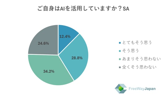 また、ご自身はAIを活用しているか聞いたところ、「あまりそう思わない」が34.2%、「そう思う」が28.8%、「全くそう思わない」が24.6%、「とてもそう思う」が12.4%という結果だった。