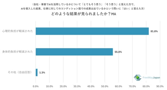 上記で「はい」と答えた方に、どのような結果が見られたか聞いたところ、「心理的負担が軽減された」が81.8%、「身体的負担が軽減された」が55.8%、その他が1.3%という結果だった。