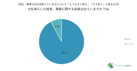 お勤めの会社、もしくは展開されている事業ではAIを活用しているかという問いに「とてもそう思う」「そう思う」と答えた方に、AIを導入した結果、業務に関する成果は出ているか聞いたところ、「はい」が92.2%、「いいえ」が7.8%という結果だった。