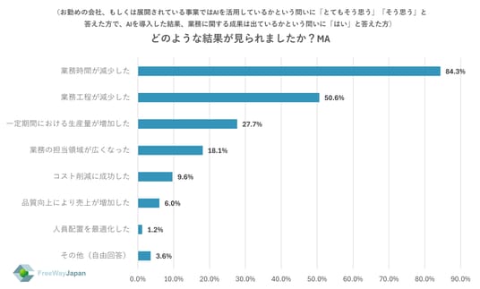 上記で「はい」と答えた方に、どのような結果が見られたか聞いたところ、最多は「業務時間が減少した」で84.3%、「業務工程が減少した」が50.6%、「一定期間における生産量が増加した」が27.7%、「業務の担当領域が広くなった」が18.1%、「コスト削減に成功した」が9.6%、「品質向上により売上が増加した」が6.0%、「人員配置を最適化した」が1.2%、その他が3.6%という結果だった。