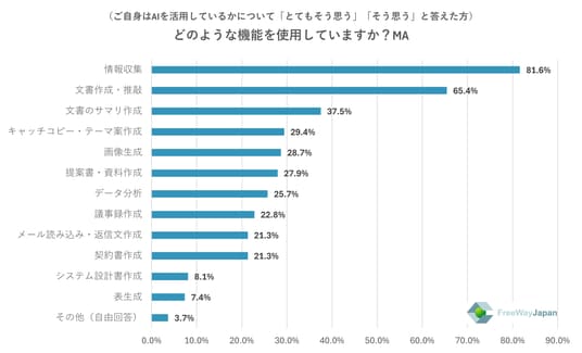 一方、ご自身はAIを活用しているかという問いに「とてもそう思う」「そう思う」と答えた方に、どのような機能を使用しているか聞いたところ、「情報収集」が81.6%、「文書作成・推敲」が65.4%、「文書のサマリ作成」が37.5%、「キャッチコピー・テーマ案作成」が29.4%、「画像生成」が28.7%、「提案書・資料作成」が27.9%、「データ分析」が25.7%、「議事録作成」が22.8%、「メール読み込み・返信文作成」「契約書作成」がそれぞれ21.3%、と続いた。