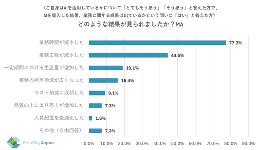 上記で「はい」と答えた方に、どのような結果が見られたか聞いたところ、最多が「業務時間が減少した」で77.3%、「業務工程が減少した」が44.5%、「一定期間における生産量が増加した」が19.1%、「業務の担当領域が広くなった」が16.4%、「コスト削減に成功した」が9.1%、「品質向上により売り上げが増加した」が7.3%、「人員配置を最適化した」が1.8%、その他が7.3%という結果だった。