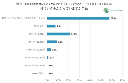 お勤めの会社、もしくは展開されている事業ではAIを活用しているかという問いに「とてもそう思う」「そう思う」と答えた方に、月にいくらかかっているか聞いたところ、「お金をかけていない、無償版を利用している」が57.8%、「2,000円以下」が7.8%、「2,001円~5,000円」が21.1%、「5,001円~10,000円」が8.9%、「10,001円~50,000円」が3.3%、「50,001円~100,000円」が1.1%、「100,001円~500,000円」「500,001円以上」は0.0%という結果だった。