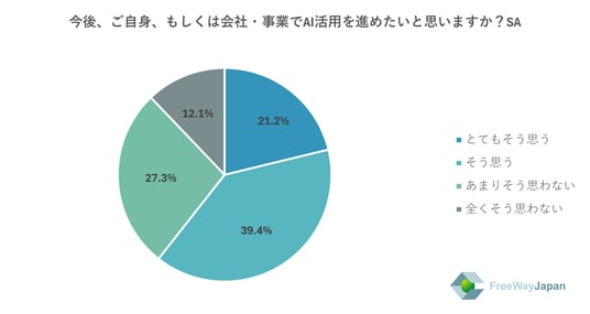 今後、ご自身、もしくは会社・事業でAI活用を進めたいと思うか聞いたところ、「そう思う」が39.4%、「あまりそう思わない」が27.3%、「とてもそう思う」が21.2%、「全くそう思わない」が12.1%という結果だった。