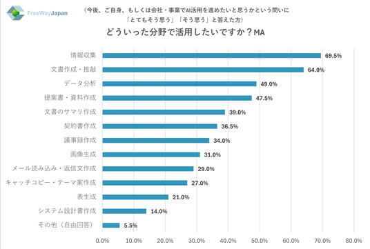 上記で「とてもそう思う」「そう思う」と答えた方に、どういった分野で活用したいか聞いたところ、「情報収集」が69.5%、「文書作成・推敲」が64.0%、「データ分析」が49.0%、「提案書・資料作成」が47.5%、「契約書作成」が36.5%、「議事録作成」が34.0%、「画像生成」が31.0%、「メール読み込み・返信文作成」が29.0%、「キャッチコピー・テーマ案作成」が27.0%、「表作成」が21.0%、「システム設計書作成」が14.0%、その他が5.5%という結果だった。