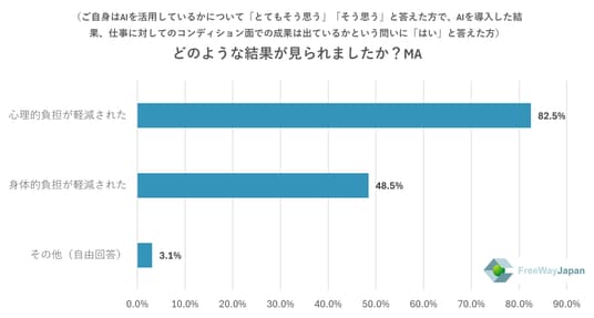 上記で「はい」と答えた方に、どのような結果が見られたか聞いたところ、「心理的負担が軽減された」が82.5%、「身体的負担が軽減された」が48.5%、その他が3.1%という結果だった。