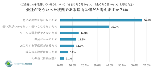 また、ご自身はAIを活用しているかという問いに「あまりそう思わない」「全くそう思わない」と答えた方に、その理由を聞いたところ、「特に必要性を感じないため」が66.0%、「使い方がわからない・使いこなせないため」が39.7%、「ツールの選定ができないため」が14.9%、「お金がかかるため」が12.9%、「AIに対する不信感があるため」が11.3%、「導入の工数がかかるため」が6.2%、その他が3.1%という結果だった。