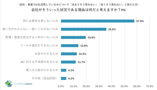 お勤めの会社、もしくは展開されている事業ではAIを活用しているかという問いに「あまりそう思わない」「全くそう思わない」と答えた方に、会社がそういった状況である理由は何だと考えるか聞いたところ、「特に必要性を感じないため」が57.9%、「使い方がわからない・使いこなせないため」が35.8%、「管理・推進を担当する人材がいないため」が19.6%、「ツールの選定ができないため」が13.8%、「お金がかかるため」が12.5%、「AIに対する不信感があるため」が11.7%、「導入の工数がかかるため」が4.2%、その他が4.2%という結果だった。