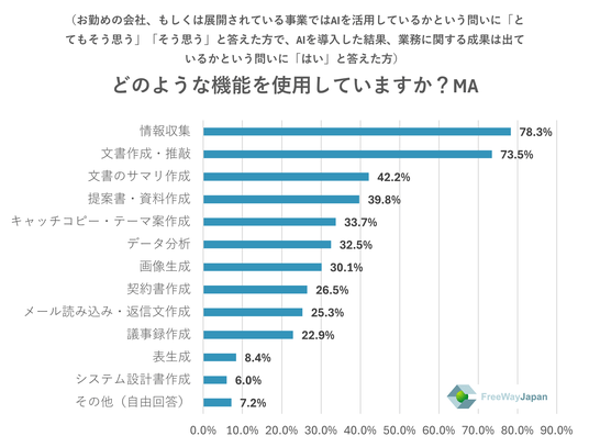 お勤めの会社、もしくは展開されている事業ではAIを活用しているかという問いに「とてもそう思う」「そう思う」と答えた方で、AIを導入した結果、業務に関する成果は出ているかという問いに「はい」と答えた方に、どのような機能を使用しているか聞いたところ、「情報収集」が78.3%、「文書作成・推敲」が73.5%、「文書のサマリ作成」が42.2%、「提案書・資料作成」が39.8%、「キャッチコピー・テーマ案作成」が33.7%、「データ分析」が32.5%、「画像生成」が30.1%、「契約書作成」が26.5%、「メール読み込み・返信文作成」が25.3%、「議事録作成」が22.9%、「表作成」が8.4%、「システム設計書作成」が6.0%、その他が7.2%という結果だった。