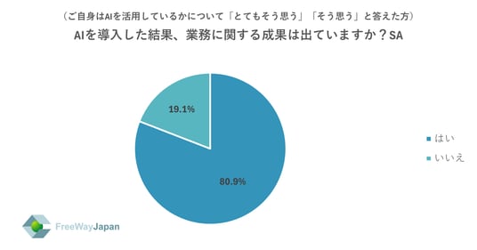一方、ご自身はAIを活用しているかという問いに「とてもそう思う」「そう思う」と答えた方に、AIを導入した結果、業務に関する成果は出ているか聞いたところ、「はい」が80.9%、「いいえ」が19.1%という結果だった。