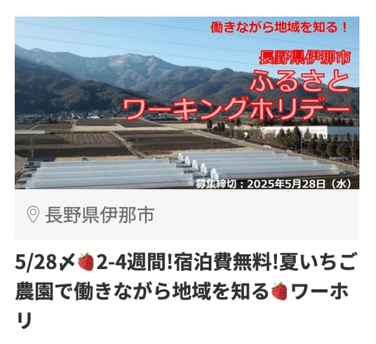 ・️住まいとレンタカー代が無料!2週間~1か月の滞在で、りんごの摘果や夏秋イチゴの収穫など、伊那ならではの「仕事」と「暮らし」を体験できるふるさとワーキングホリデーが不動の人気。