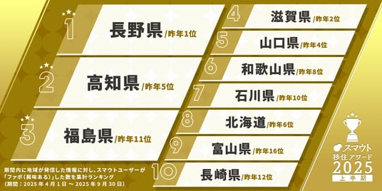 株式会社カヤック(本社:神奈川県鎌倉市、代表取締役CEO:柳澤大輔、東証グロース3904)は、自社が運営する地域とつながるプラットフォーム「スマウト」において、移住希望者の興味・関心を集める人気地域をランキング化した「スマウト移住アワード2025上半期」を、10月30日(木)に発表しました。