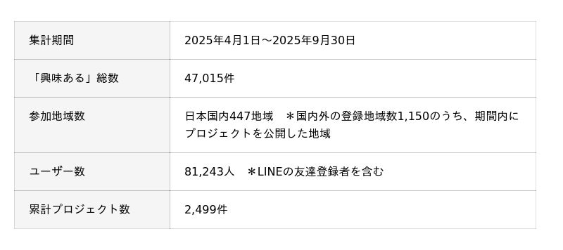 このランキングは、「スマウト」に登録している約8万人のユーザー(2025年9月30日時点)を対象に、2025年度上半期(2025年4月1日~9月30日)に地域が発信した情報(プロジェクト)に対して、同期間中に押された「興味ある」ボタンの合計数を集計して作成しています。